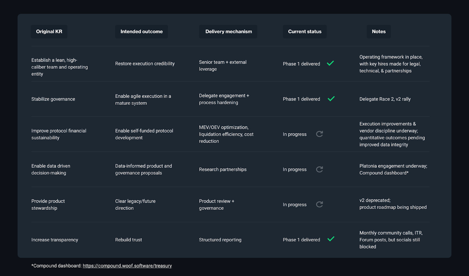 The following sections mirror the Key Results and success criteria set out in the Compound Foundation proposal. While we are still in the early innings, with just a few months of operations, we intend to assess progress against those same benchmarks, while calling out noteworthy milestones accomplished in areas that we could not have predicted.