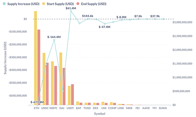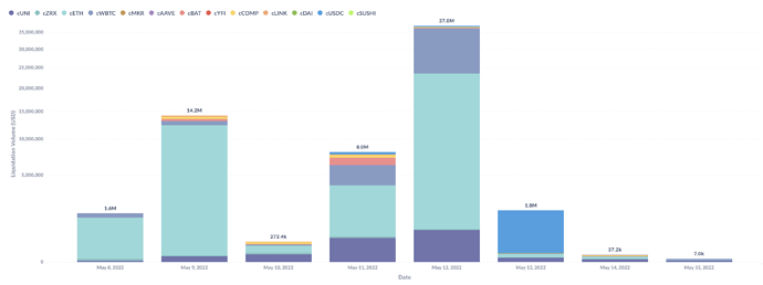 From May 8th to May 15th, Compound experienced around $63M in liquidations primarily driven by ETH. These are liquidations that were healthily absorbed by the market (i.e., did not lead to insolvency).