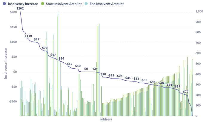 Compound experienced around 9k more in insolvencies in the past few days largely driven by dust accounts. The below charts shows insolvent accounts on May 15 that were solvent on May 8th (i.e., new insolvent accounts). As you can see, the largest newly insolvent account was ~$300.