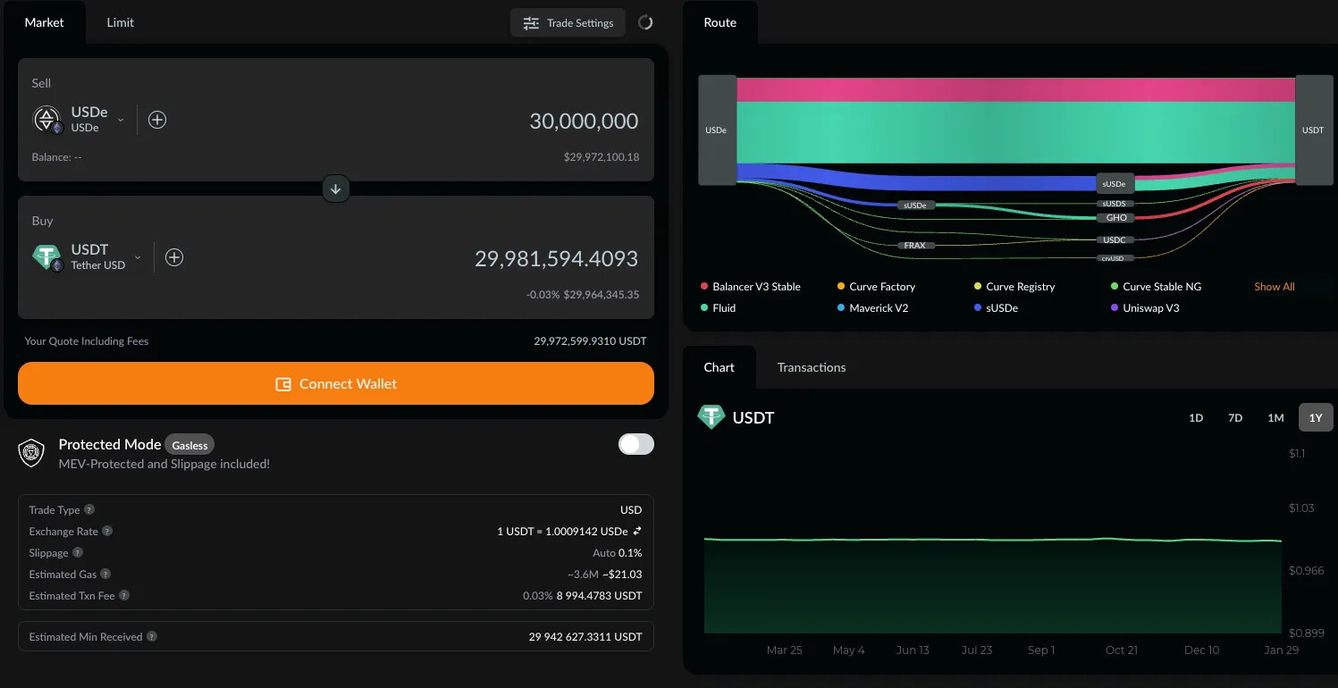 As seen above, a 30M cap of USDe can be swapped to USDC or USDT with less than 1% slippage.