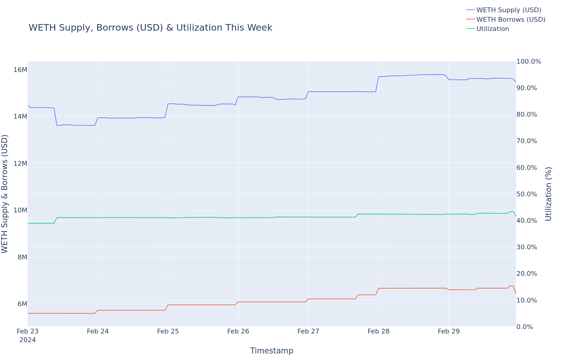 WETH utilization increased 2.92%, from 43.15% to 44.41%.