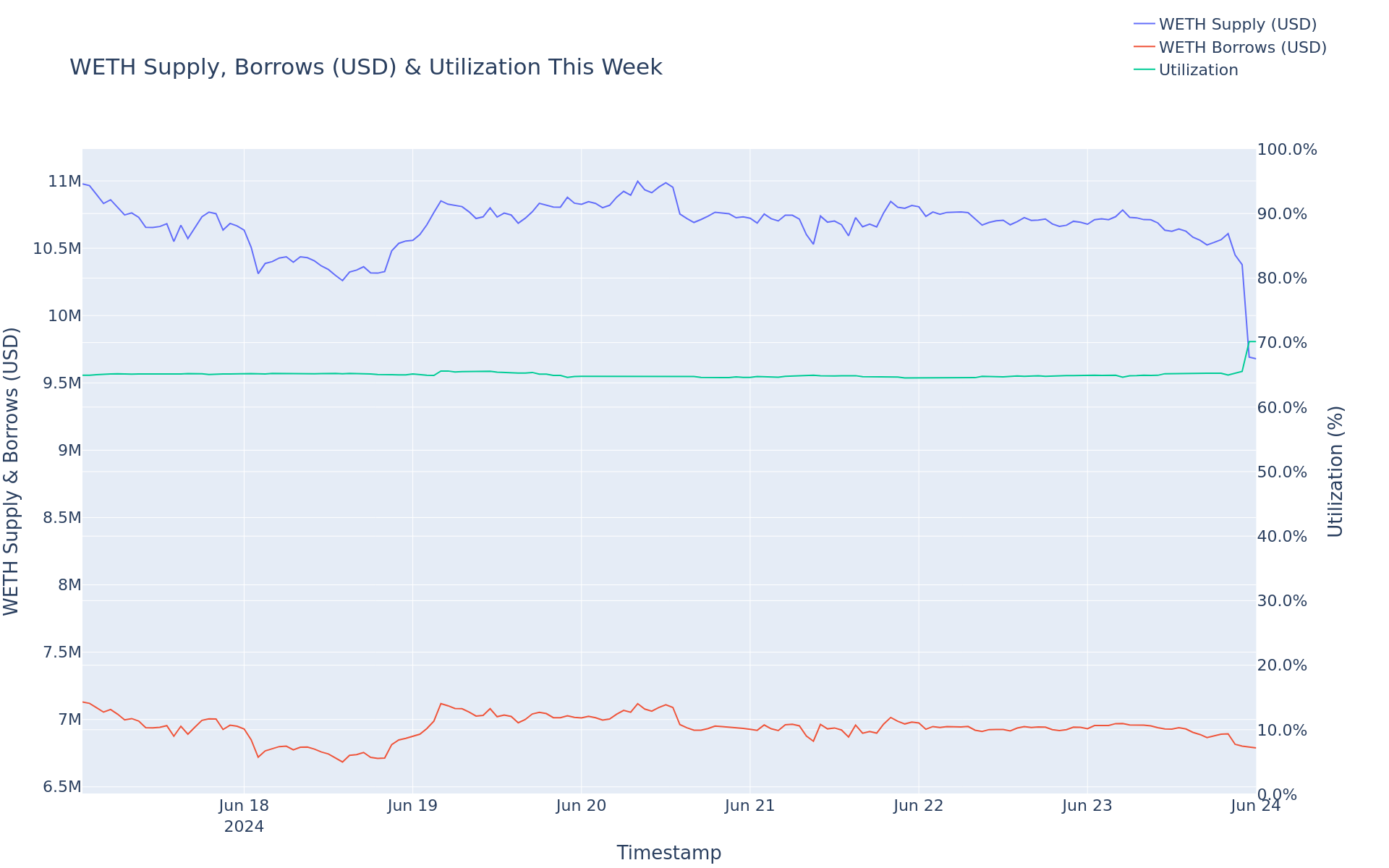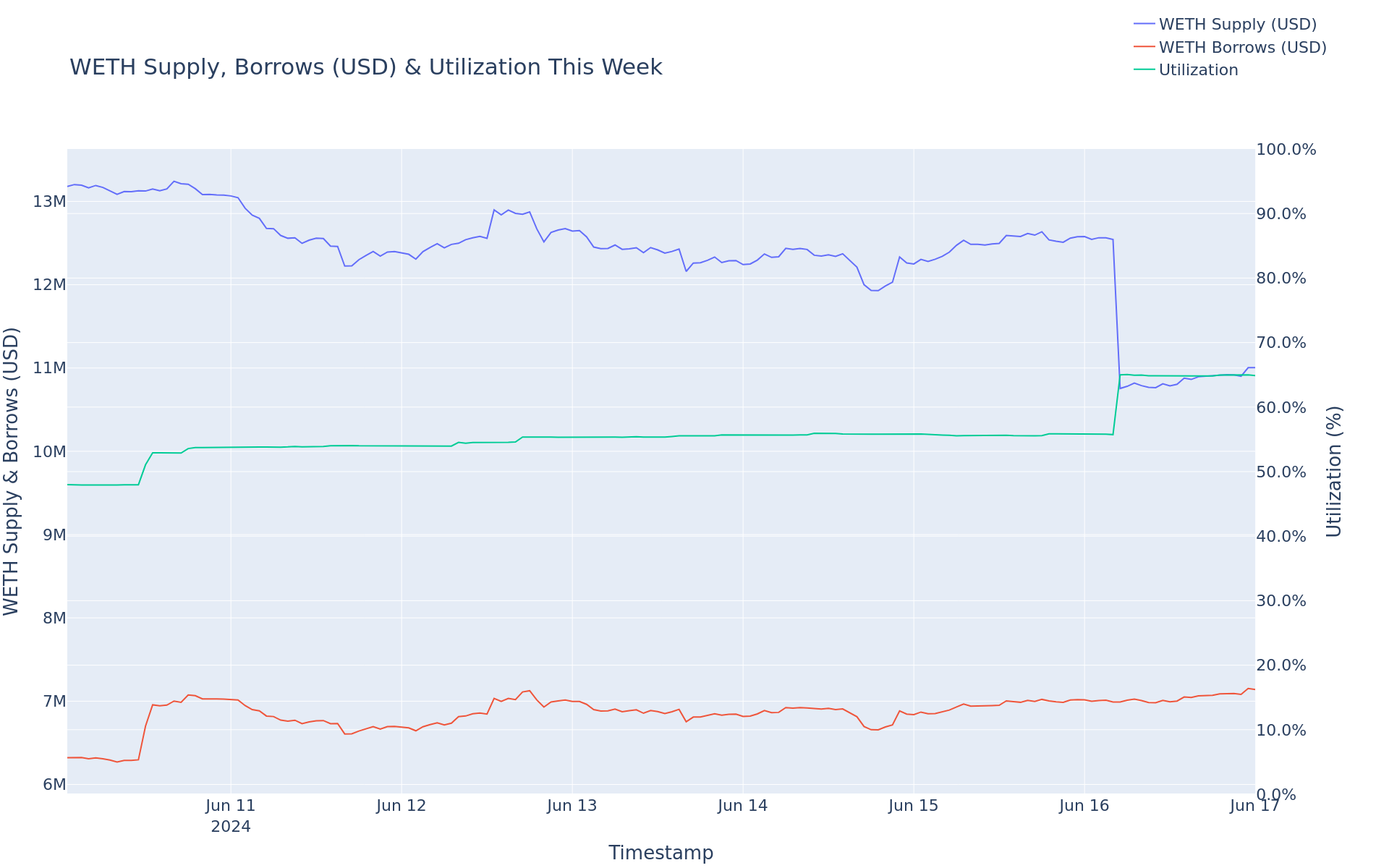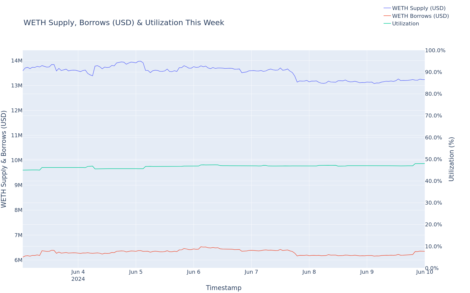 - WETH Supply increased 16.85%, from $11.77M to $13.76M.