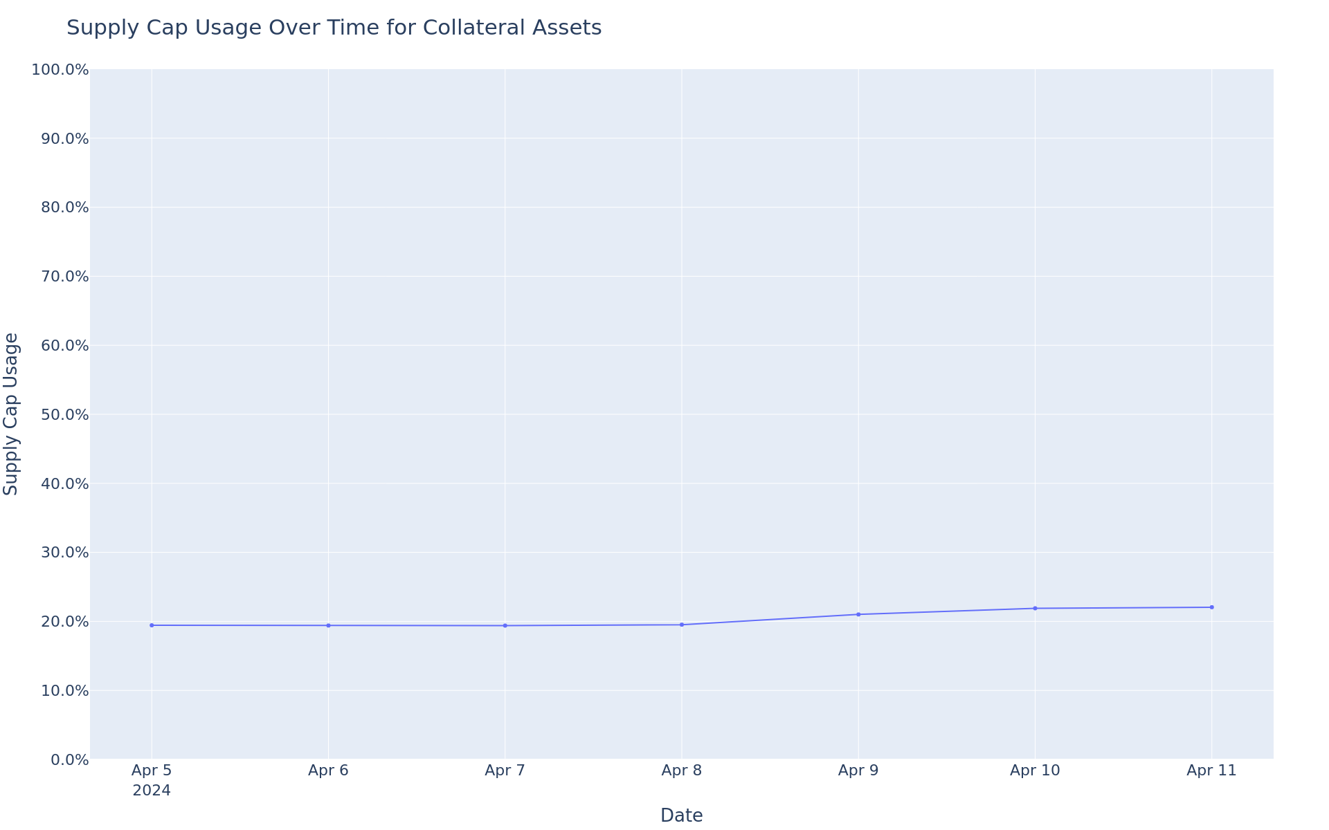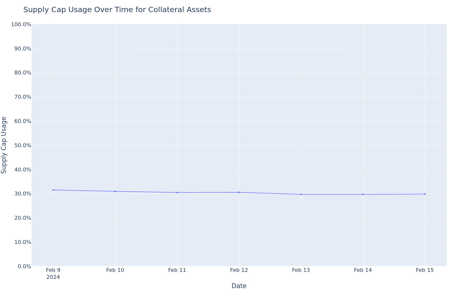 This graph shows the supply cap usage (supply / supply cap) of all collateral assets over the past week.