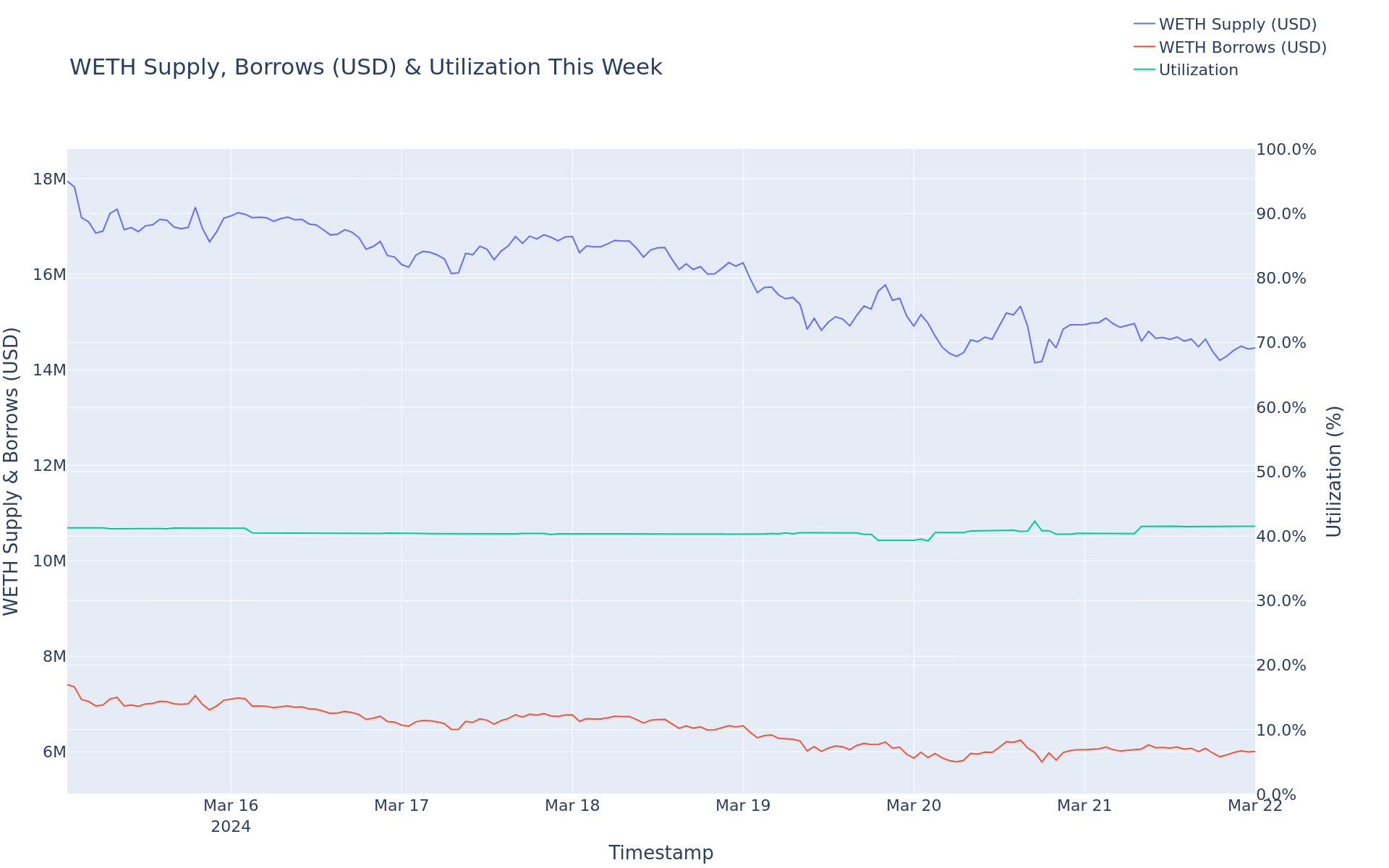 - WETH Supply decreased 3.65%, from $18.48M to $17.81M.
