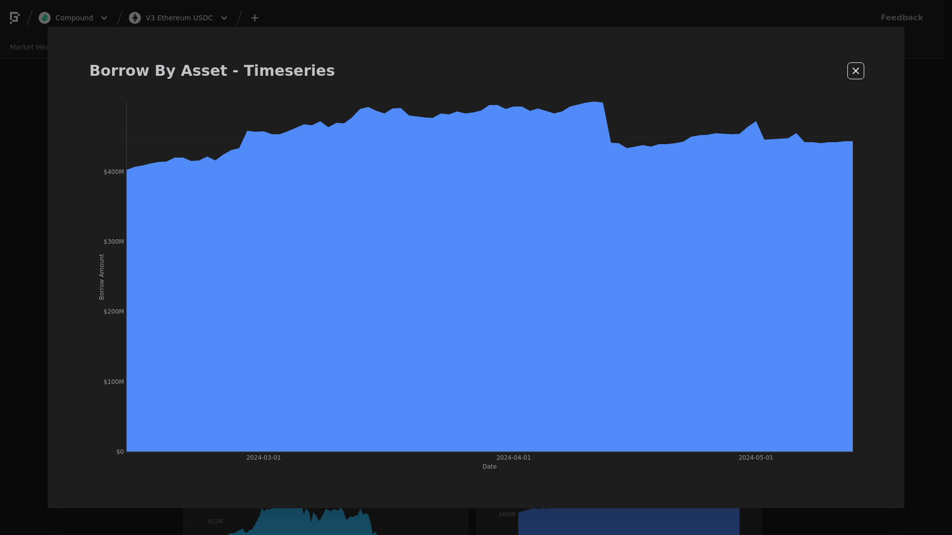 USDC Borrows decreased 1.81%, from $506.21M to $497.03M.