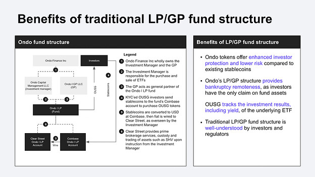 On Feb 2, 2023, Ondo launched Ondo I LP (the “Fund”) and its Ondo Short-Term US Government Bond Fund limited partnership class (OUSG), creating a tokenized vehicle with daily liquidity backed by the Blackrock iShares Short Treasury Bond ETF (SHV). OUSG represents ownership in a traditional, bankruptcy-remote Delaware limited partnership (Ondo I LP), which holds its assets at Clear Street, a prime broker and qualified custodian. The Fund receives third-party fund administration from NAV Consulting and will receive an annual audit.